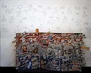 Cardboard screen with tabloid newspaper headlines, Blue carbon wall drawings. 1997.